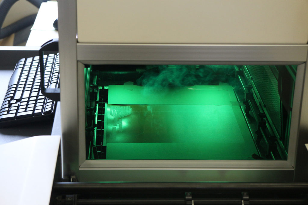 実際にお仕事中の新旧印刷機器をご説明いただいたほか、立体への印刷やレーザー加工機では学生各自のお土産を作成しながら説明してくださいました。